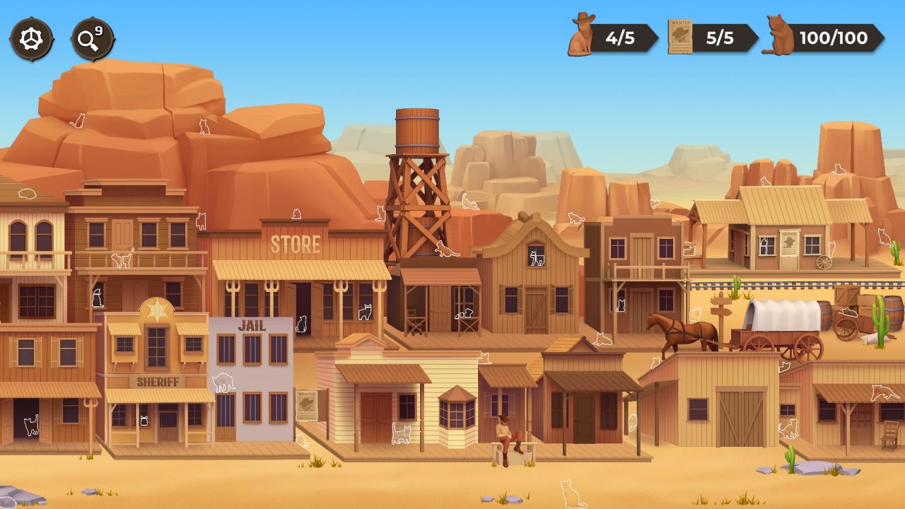 Cat Search In The Wild West: Walkthrough 100% January 9, 2024 by NealS This guide allow you to find all cats. Walkthrough Don’t use hints for get all achievements. Outlaws cats are random in each playthrough. Note: Please click the image to enlarge it!