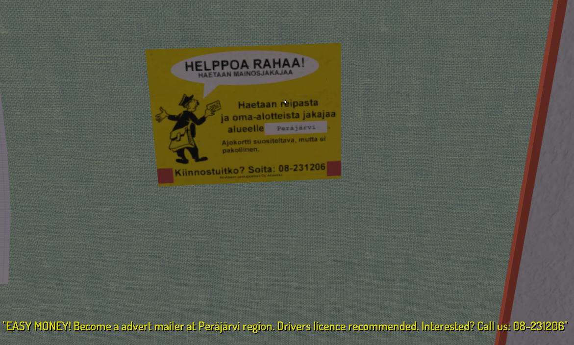 - Flyer Distributor: An ad says, “Easy money! Become a flyer distributor in the Perjärvi region. Driver’s license welcomed. Call us! 08231206.” Go home, use the telephone, and dial that number. Note: This job does not start immediately after calling.